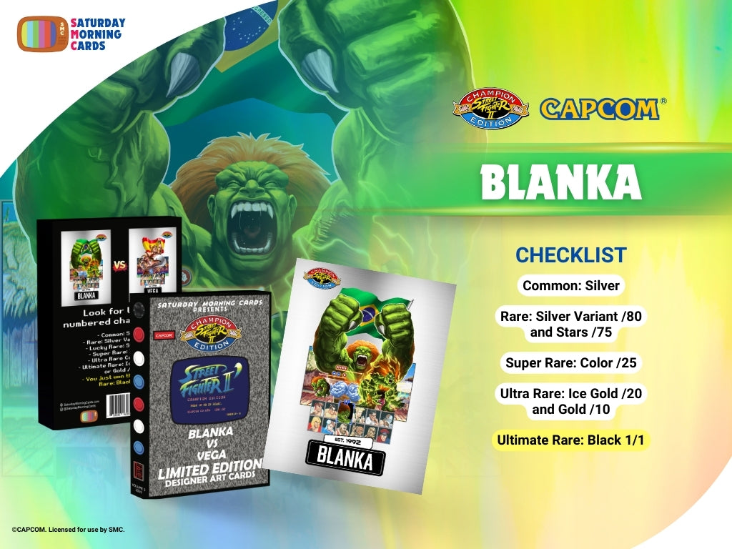 Street Fighter 2 Vol 5 Blanka vs Vega: Officially licensed Blind Box Designer Art Cards. One sealed case of (10) two cards blind boxes. Each single box of Street Fighter 2: Vol. 5 comes with both Blanka and Vega in this brand new, limited edition, release.